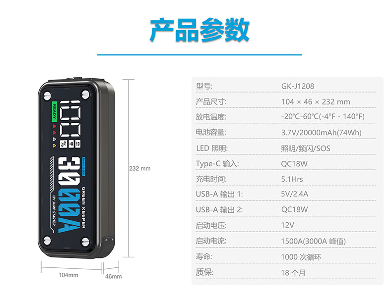 **强大的汽车电池应急启动器**:这款格睿铠铂应急启动器GK-J1208是您轻松启动汽车电池的理想解决方案。凭借强大的3000A峰值电流,这款便携式电池启动器可确保为高达8.0L汽油和柴油发动机提供快速可靠的启动,是每位驾驶员的必备工具。